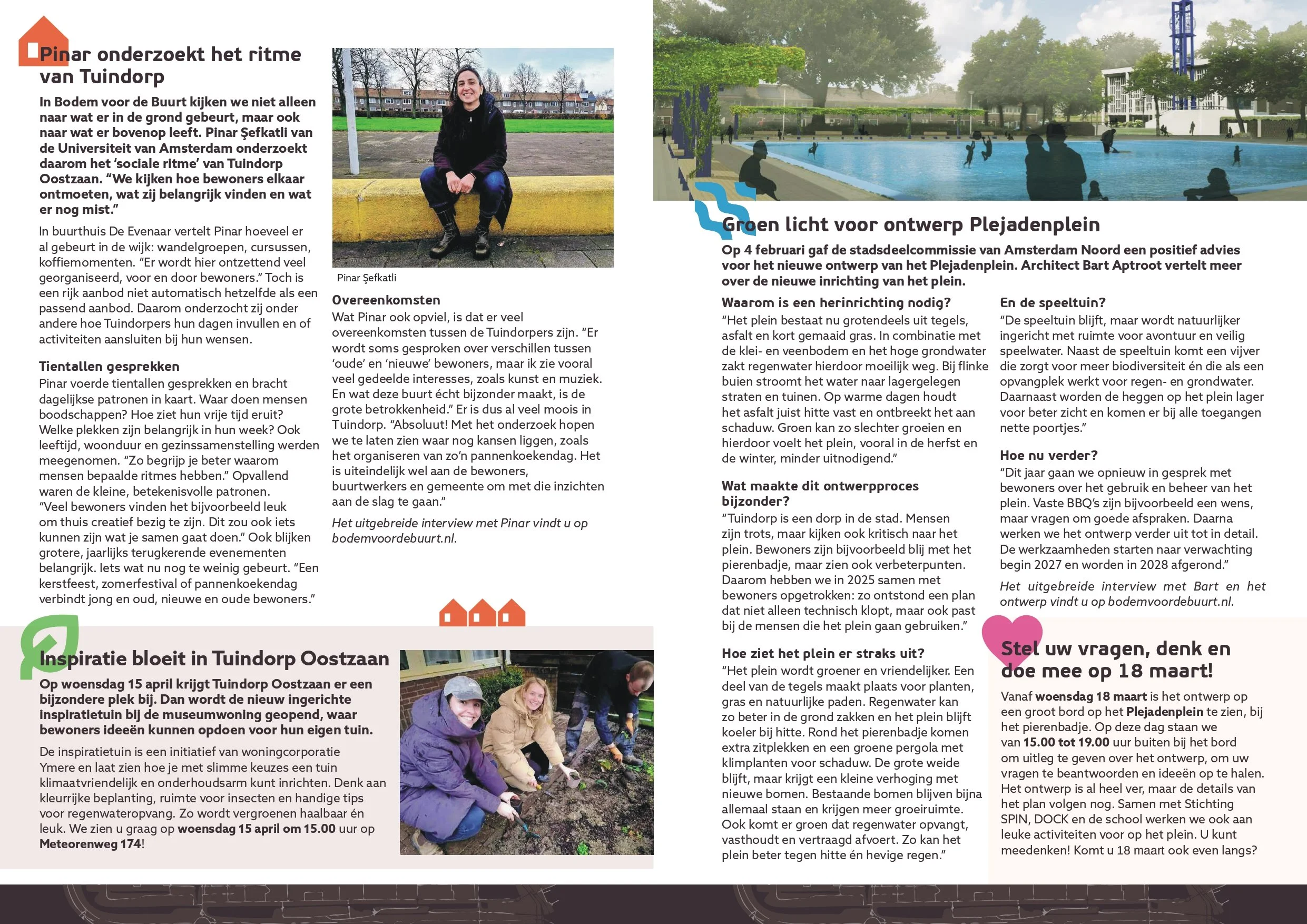 Architect Bart Aptroot vertelt wat er op het Plejadenplein gaat veranderen en wat blijft. Op woensdag 18 maart kunt u het ontwerp op het plein bekijken en uw vragen stellen. Onderzoeker Pinar Şefkatli deelt haar kijk op het sociale leven in Tuindorp en laat zien waar nog kansen liggen. Ook leest u waarom de mol belangrijk is voor een gezonde bodem.